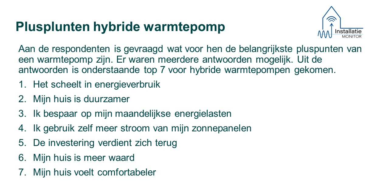 De meeste warmtepompbezitters (ruim 35%) kunnen geen nadelen noemen van hun warmtepompinstallatie. Voor all-electric warmtepompen is de omvang van de installatie het meest genoemde nadeel, terwijl bij hybride warmtepompen het behoud van gasaansluiting het meest voorkomt. Bij 19% van de respondenten functioneerde de warmtepomp niet zoals verwacht vanwege onjuiste inregeling. Dit benadrukt het belang van een correcte afstelling van het afgiftesysteem, zowel voor energieprestatie als comfortniveau. 8% van de warmtepompbezitters gaf aan dat ze aanvankelijk niet tevreden waren en moesten wennen aan het nieuwe systeem. Voor 7% van de respondenten trad er een storing op, terwijl bij 4% de warmtepomp niet goed was aangesloten.