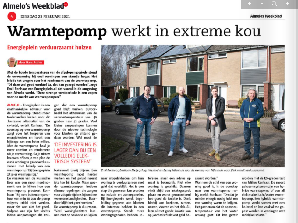 Met de koude temperaturen van de afgelopen periode stond de verwarming bij veel woningen een standje hoger. Het leidde tot vragen over het rendement van de warmtepomp. “Of deze wel goed werkte? Ja, dat kan gezegd worden’’, zegt Emil van Energieplein.nl dat vooral in de omgeving van Almelo werkt. “Deze strenge vorstperiode is een zegen voor de markt van warmtepompen.’’