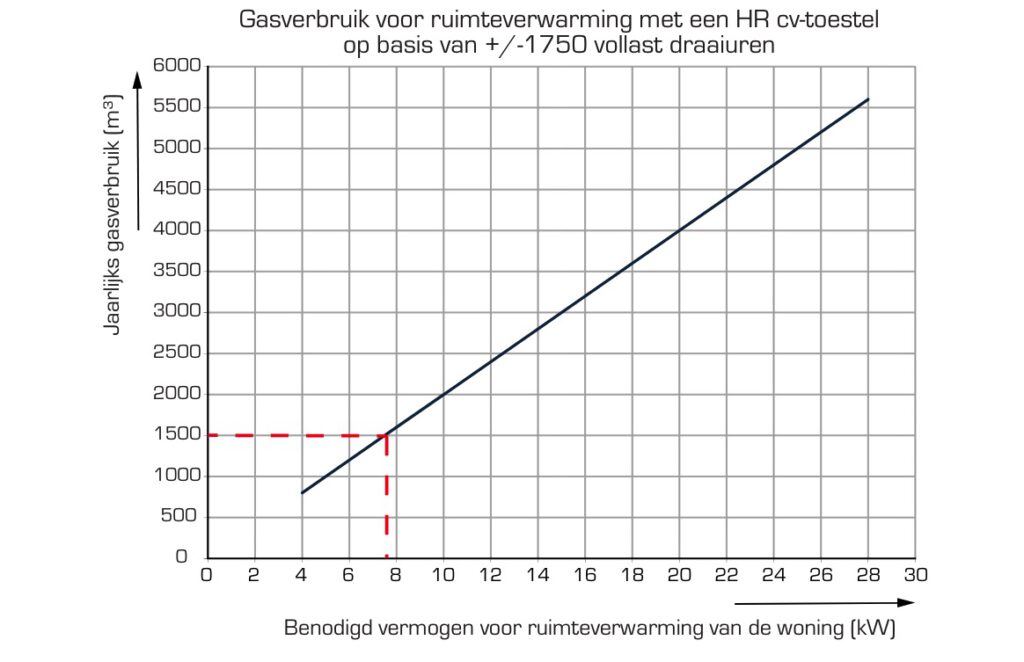 In onderstaande grafiek wordt de relatie tussen het gasverbruik voor ruimteverwarming en het vereiste vermogen weergegeven (het gasverbruik gedeeld door een factor 200 geeft het vereiste vermogen). Dit is een handige regel, gebaseerd op een verbruik van ongeveer 1.750 vollasturen per jaar. Het opgegeven gasverbruik moet worden aangepast voor warmwatervoorziening. Over het algemeen wordt hiervoor een gasverbruik van circa 100 m3 per persoon per jaar aangenomen. Bijvoorbeeld, bij een jaarlijks verbruik van 1.900 m3 en een gezin van 4 personen resulteert dit in een gasverbruik van 1.500 m3 voor ruimteverwarming. In de grafiek zie je dat dit overeenkomt met een vermogen van 7,5 kW. Bij een volledig elektrische toepassing kies je het vermogen van de warmtepomp op 80% van het vereiste vermogen.