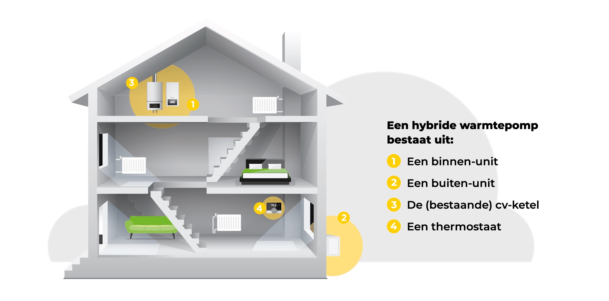 Deze woning in Hengelo is helemaal klaar voor de winter. In een jaar tijd zijn alle belangrijke zaken aangepakt zodat deze woning helemaal goed geïsoleerd is. Er is PIF aangebracht onder de vloer zodat deze een hoge isolatie waarde (Rd) van 3,5 heeft. Alle ramen en kozijnen zijn vervangen voor HR++ glas zodat er minimale warmteverlies is. Voor de meest optimale situatie met een hybride warmtepomp is altijd goed om een woning zo veel mogelijk te isoleren. Dat levert een hoger rendement op van de warmtepomp omdat er sprake is van minder warmteverlies. Bij matige isolatie is er sprake van 90 w/m2 benodigd vermogen maar door de goede isolatie is dit nu slechts 60 w/m2. Hierdoor kan een hybride warmtepomp goed zijn werk doen bij deze woning. Doordat deze grondig is aangepakt niet alleen klaar voor de winter maar ook de toekomst. Ten slotte krijgt deze woning een Energielabel A met alle aanpassingen die zijn gedaan. Een huis met energielabel A levert 10% meer op dan een vergelijkbare woning met energielabel D.